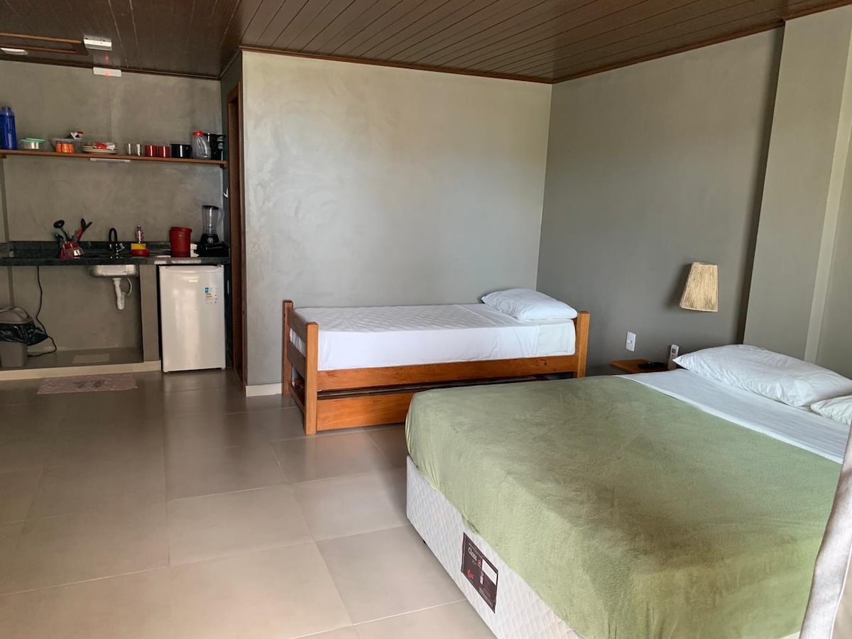 We are at Condomínio Mar Doce Lar, on the 2nd beach, close to the best restaurants in Morro, 300 meters from the beach. Our space comfortably accommodates up to 4 people. We have a bedroom with a double bed and in the living room, a futon sofa bed, very comfortable and spacious. The bedroom and living room are equipped with air-conditioning and 4K TV. We have all kitchen utensils, coffee maker, blender, sandwich maker, microwave, cooktop, refrigerator, iron and hairdryer. Bed and bath linens are available.
