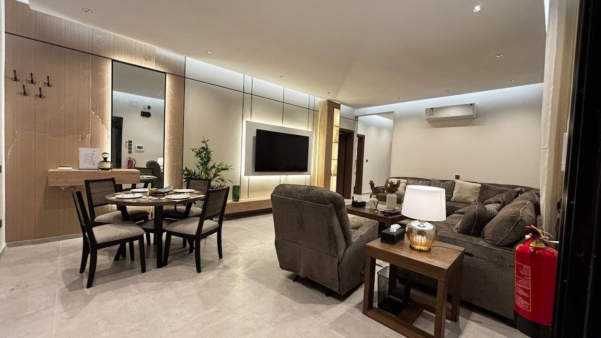 Luxury Aparthotel - Self Check-in Located in the heart of Abha on the ring road With a partial view of the Green Mountain and the Fog Roundabout Place details: Elegantly designed living room with 75-inch screen Coffee bar and morning breakfast + complimentary hospitality Bedroom with master bed, bathroom and full kitchen Internet open at 500mp Subscription to Shahid VIP + Shahid Sports Netflix + stc tv subscription Designed for you to meet all the needs of the guest To live a unique and special experience in Abha We wish you a pleasant stay...🤍