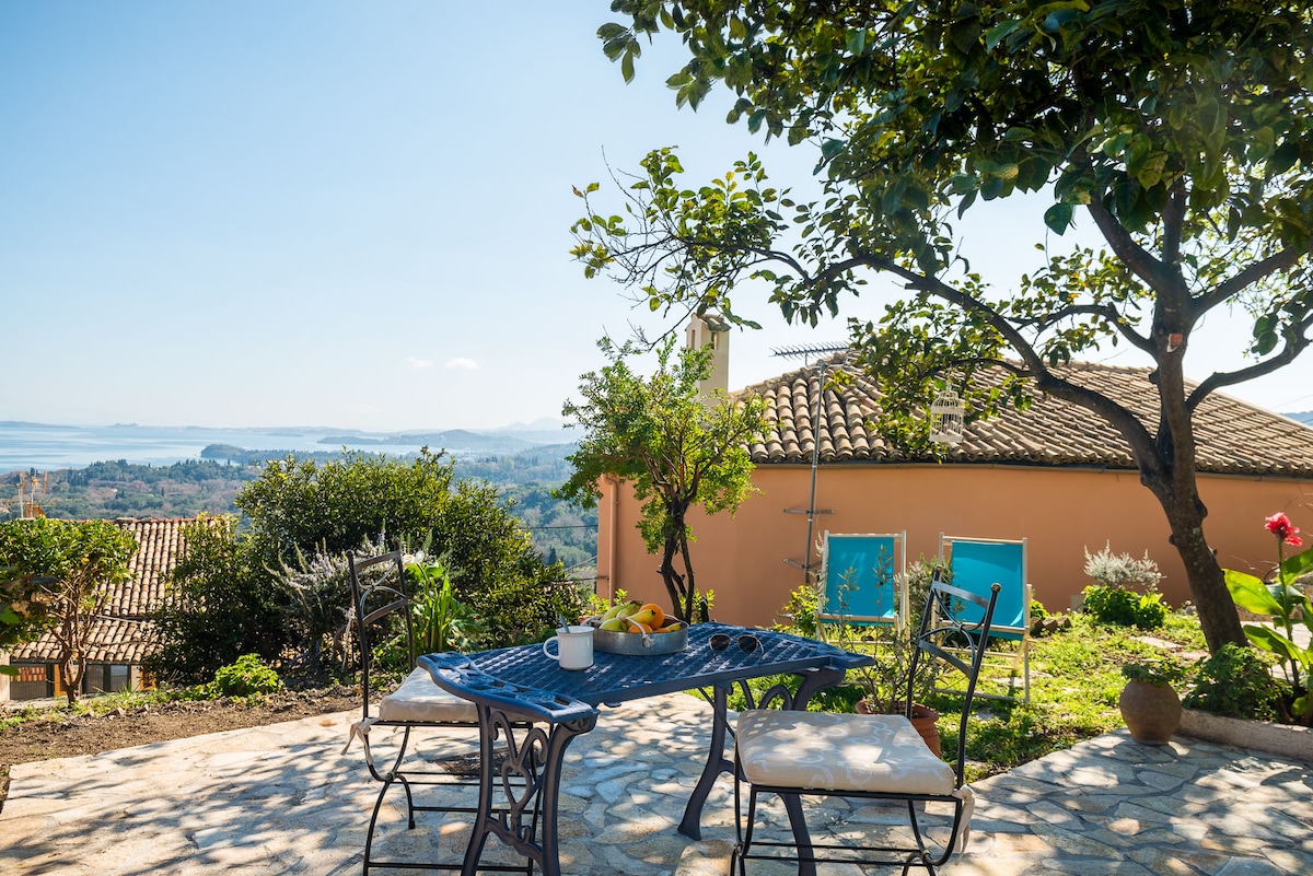An old, two-person air-conditioned cottage with a view of the Ionian Sea. Panoramic views through the olive trees in the charming old Greek village of Agios Markos in the island's northern region. Take strolls through the village or explore the olive groves and surrounding mountains for breathtaking island vistas. A short drive gets you to the nearby stores and amenities. For wonderful alfresco dining, there is a gazebo, a table, chairs, and a BBQ outside.