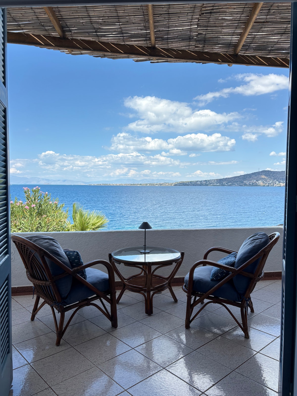 Our newly renovated holiday 45m2 apartment is stylish, minimal yet cozy to make you feel right at home. A haven of white and palest grey, the apartment is filled with natural light throughout the day. Our private 100m2 terrace will give you all the serenity and tranquility you need when on vacation by enjoying the stunning view of Vouliagmeni's Bay. Close to beaches, ski school, tennis court, basketball court, hotels, restaurants, forest, parks, 30' from Athens Centre, 30' from Athens Airport.