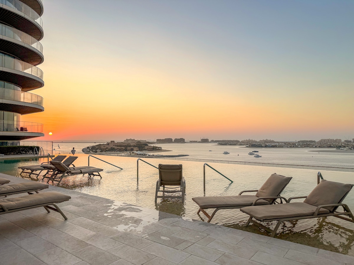 An infinity swimming pool is showcased at sunset, with modern lounge chairs positioned at the water's edge. The iconic Burj Khalifa towers in the background, surrounded by a panoramic city skyline, while soft hues of orange and pink fill the sky.