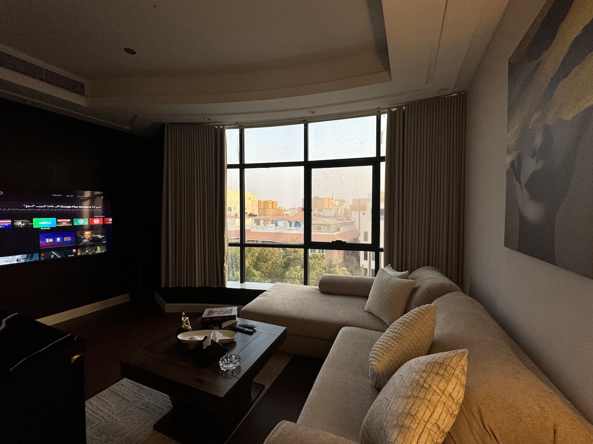A warm studio with a unique and exceptional design that offers an unforgettable living experience, equipped with the latest technology and electrical appliances. The sofa, which turns into a cinema seat, overlooks a 75-inch screen and has a warm Jacuzzi. It is located in the luxurious Al-Nahda neighborhood on King's Road, the vibrant main artery of Jeddah. You live next to the Corniche, the most luxurious malls, restaurants, the airport and all services. 🏖️🏄🏻♀️🌅