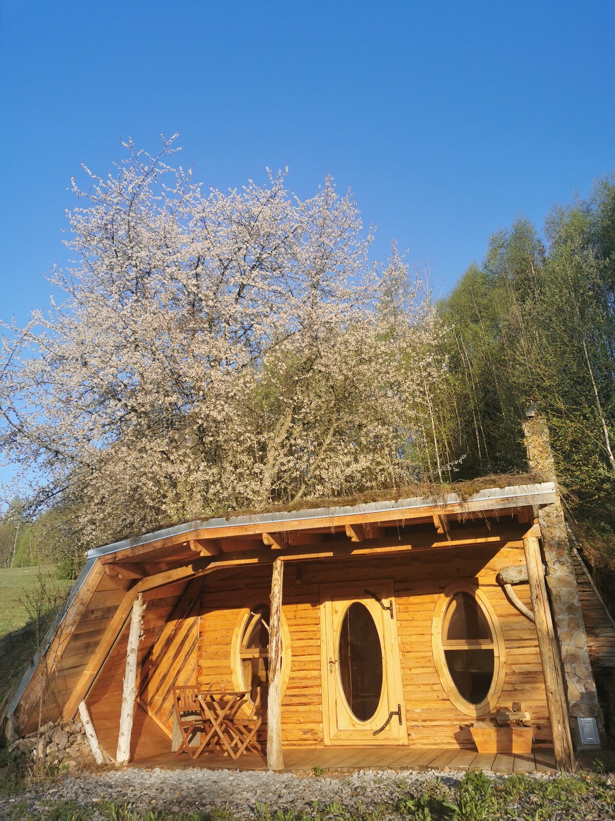 The natural house, hidden within the mountain slope,is located in a fairytale landscape.Authentic experience!The location of about 5 hectares invites you to relax, rest and reconnect with nature.The cottage, cool in summer and warm in winter,is designed to ensure optimal comfort in any season.With its 30sqm,private bathroom,double bed,a wood stove and a generous terrace,it provides a truly unique stay.THE SMOKING AREA is far from the houses.The outdoor kitchen is shared between the two houses.