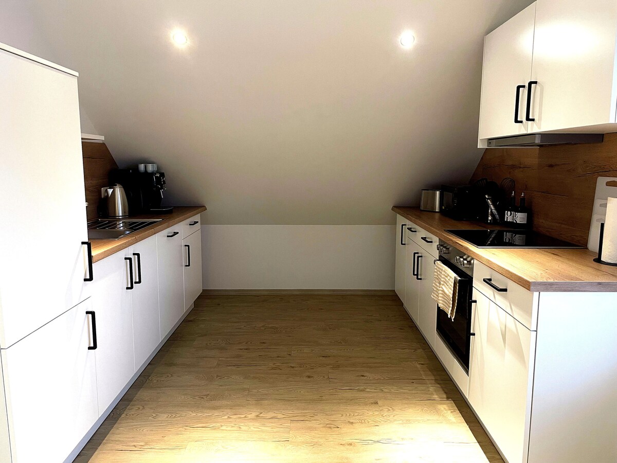 Forget your worries in this spacious and serene space. Whether privately or on business. Our accommodation offers all the amenities you could wish for. Large living-dining area with open kitchen and fireplace. A bathroom with walk-in shower, bathtub and double sink, as well as two bedrooms. The master bedroom has a height-adjustable desk for creative work. The 15 square meter balcony offers wonderful views of the countryside.