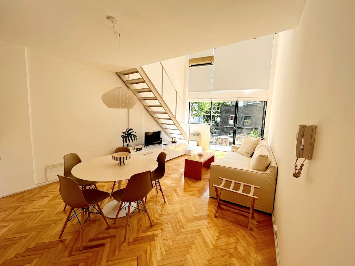Amazing LOFT located in the heart of Palermo Hollywood. The building, "Los Silos de Dorrego",is a refurbished ex grain factory from 1920, surrounded with a huge garden full of ancient trees. The complex has this green space to enjoy, with a large (heated) swimming-pool. Also has a gym, dry sauna and a restaurant & bar only for residents. The loft is super unique and stylish. With a cool taste in every detail. double high and tall walls with huge windows, both with views to the pool and garden.