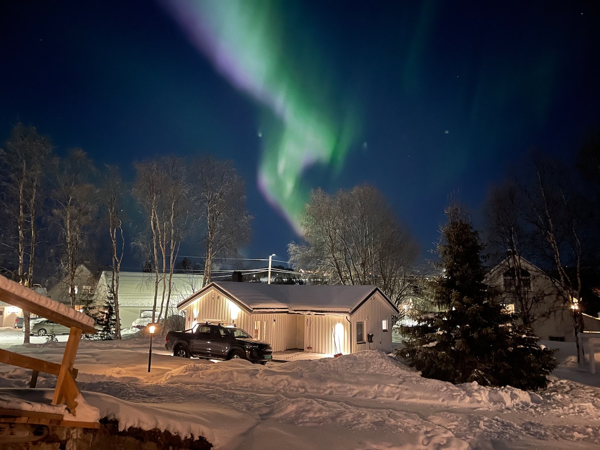Relax with the whole family in this modern and beautiful cabin. Fantastic location, great sunlight, close to nature, peace and quiet, and plenty of opportunities for wonderful outdoor experiences in both summer and winter. Alta city center is just 20 minutes away, offering shops, cafes, a water park,and a lot of hiking opportunities. Near the cabin, you’ll find miles of ski trails, snowmobile trails, a ski slope, climbing park, and a café. Check in, relax and find your peace—welcome to us!