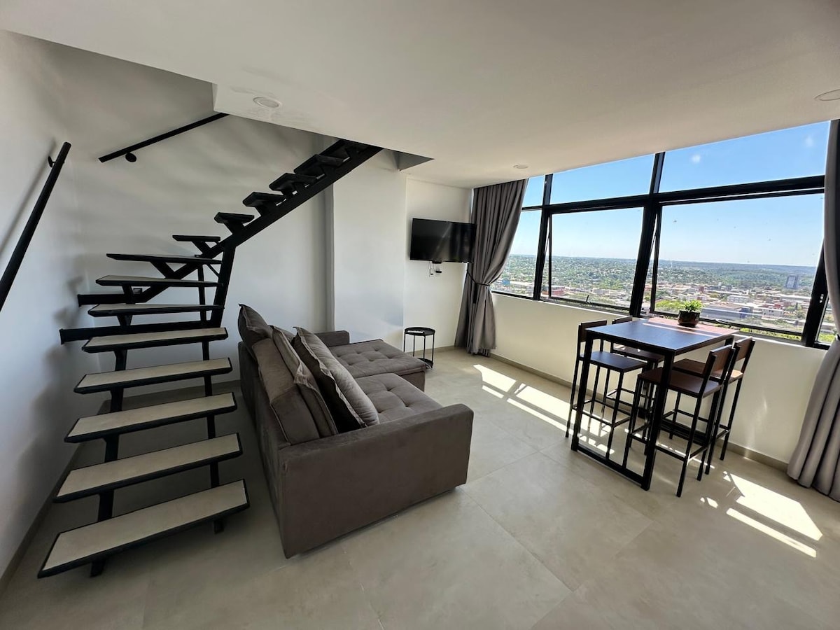 Located in Ciudad del Este, one of the fastest growing cities in Paraguay, this modern and finely decorated apartment has one bedroom, one bathroom, an equipped kitchen, a cozy living room with a sofa bed and Smart TV, and a private balcony with an amazing view of the surroundings. The building offers amenities such as pool, gym and a terrace with a panoramic view.