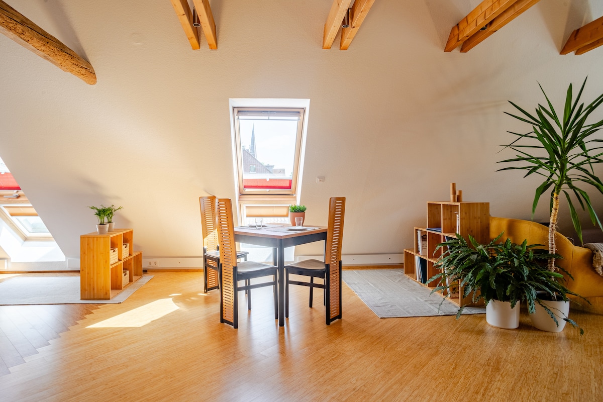 Attic apartment completed in August 2021 with a quiet location in the center of the village. The living area is open plan and offers a view into the gable. The well-equipped fitted kitchen was included in the open concept. The apartment is equipped with underfloor heating and bamboo parquet and also has a fireplace The view through the floor-to-ceiling windows falls on the quiet residential street or the green roof. The daylight bathroom is equipped with a quarter-circle shower.