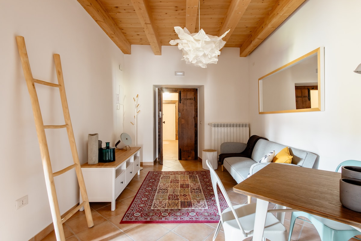 EN: The apartment is located on the first floor of a 15th century building protected by the Superintendency, in the historic center. Its strategic location allows you to reach the city's main attractions without the use of vehicles, while the careful restoration allows you to fully grasp the city's magical atmosphere. EN: The flat is located in a 15th century Palace, protected by the Cultural Heritage, in the historical city center of L'Aquila.