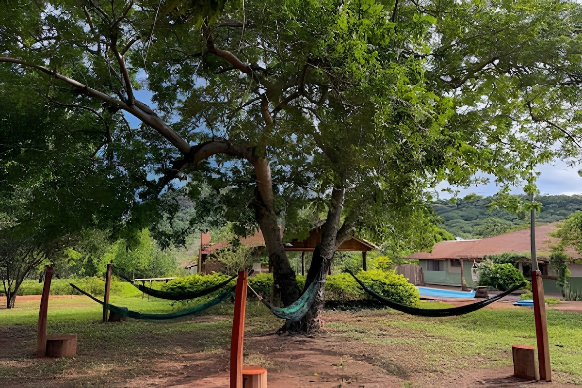 Chalet with exclusive kitchen, in an area of 5 hectares in contact with nature and animals, exclusive access to the Aquidauana River with a floating dock for fishing, huge leisure area with large swimming pool, volleyball and soccer court, sand, lake, balcony, hammocks for resting, barbecue, full en-suite bathroom, air-conditioning, internal bathroom, equipped kitchen, stove, refrigerator, microwave, with all utensils, all exclusive space, we receive one family at a time. Close to the Pantanal terroir.