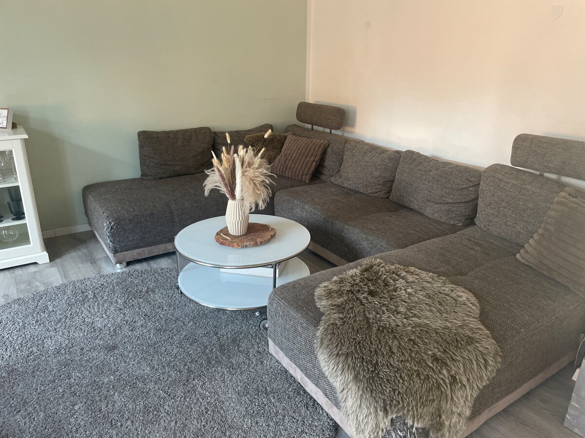 Sit back and relax in this quiet, stylish place. We offer a separate apartment in our detached family house. For your sole use are a bedroom, a shower room with toilet, a fully equipped kitchen with a coffee machine, stove, oven, refrigerator and dishwasher and a 33 m², large living/dining room. Since the laundry room is also used by us, we occasionally have to use the staircase and the hallway.