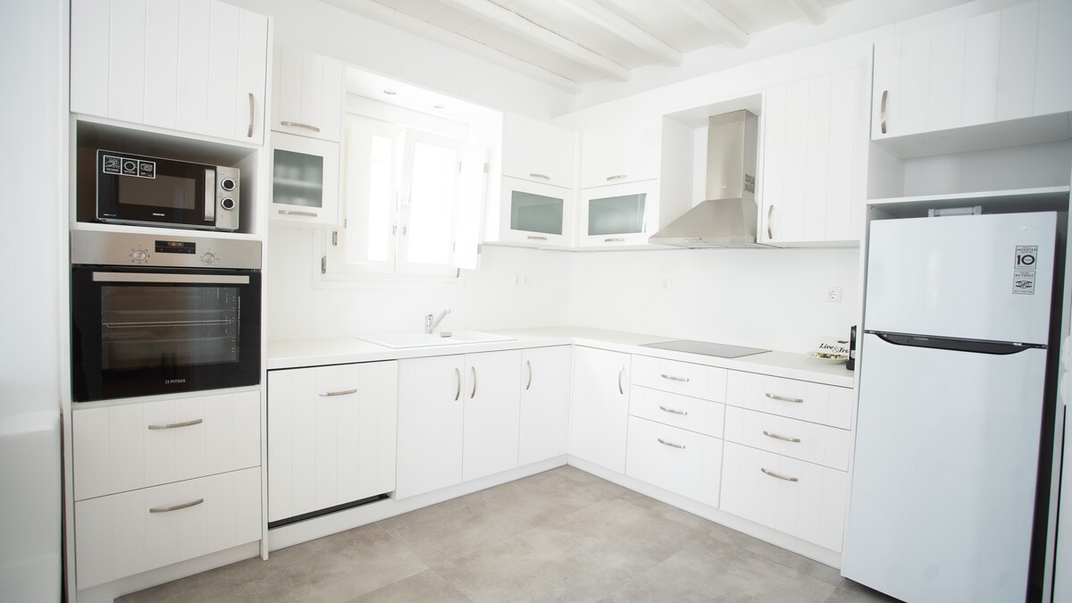 The seductive,brand new house is a luxurious heaven for tranquil repose, The Myconian's architecture house consists of 2 bedrooms with king size double beds (splittable to single beds), 2.5 bathrooms, living room with 1 sofa , satellite TV, free WI FI Internet - dining room, fully equipped kitchen, terrace with wooden table, outdoor jacuzzi , garden and private parking area.