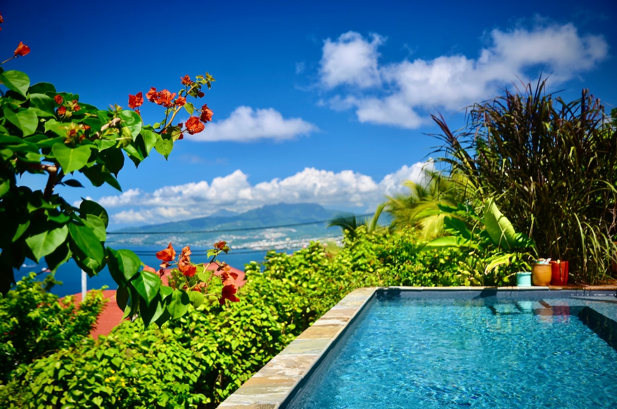 Turtle Bay Rentals Grande-Anse – Martinique Elevated studio mini villa with panoramic views of the sea and countryside. Sea access is a 50 m walk away. Beach known for its many green turtles visible in snorkel mask all year round. Composed of an air-conditioned bedroom, a shower room with toilet, an equipped kitchen on the covered terrace and a private 2 m*3 m pool on the uncovered terrace. TiSable restaurant 50 m away and small shops 500 m away.