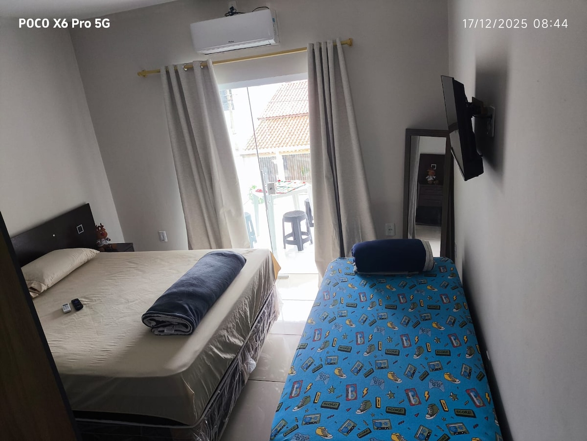Stay in a family home! En-suite with private bathroom and equipped with a double bed and a bunk bed (sleeps four in total), air-conditioning, fan and wardrobe. In the common area, we have two living rooms and a garage. Located in the center, our house is 400 meters from the bus station, 500 meters from the Aparecida fair, 800 meters from the Old Basilica and 1 km from the National Sanctuary. Close to restaurants, markets, shops and a hospital. My family awaits yours!