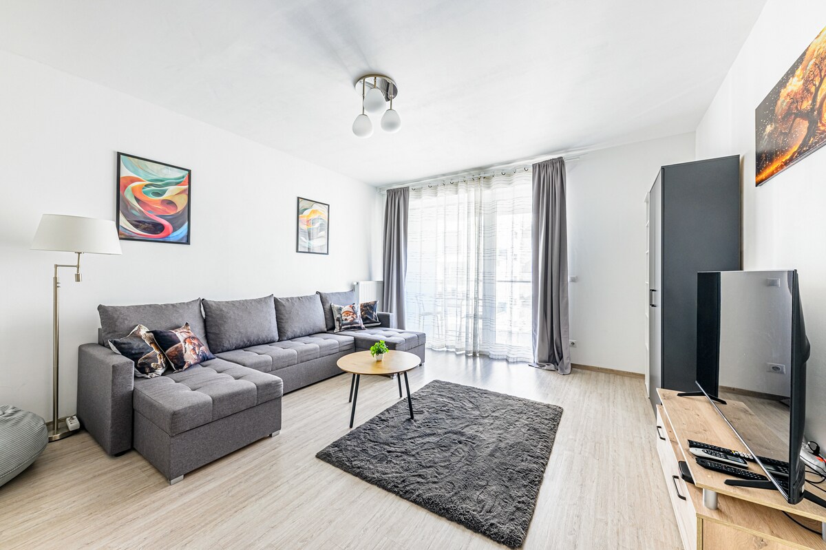 Danube Panorama & Luxury: 78 m² Apt + Free Garage 8th floor: 78 m² apartment, huge 65 m² glass living room, 14 m² terrace. Safety: 24/7 Professional Security & Guard Service. Garage: Free underground parking with direct elevator access to the unit. Location: Bakery & cafés in the building, ATM right next to it. Extras: Fan-coil cooling & heating, large Smart TV with Netflix, washing machine. Ultimate comfort with the city's best panoramic view!