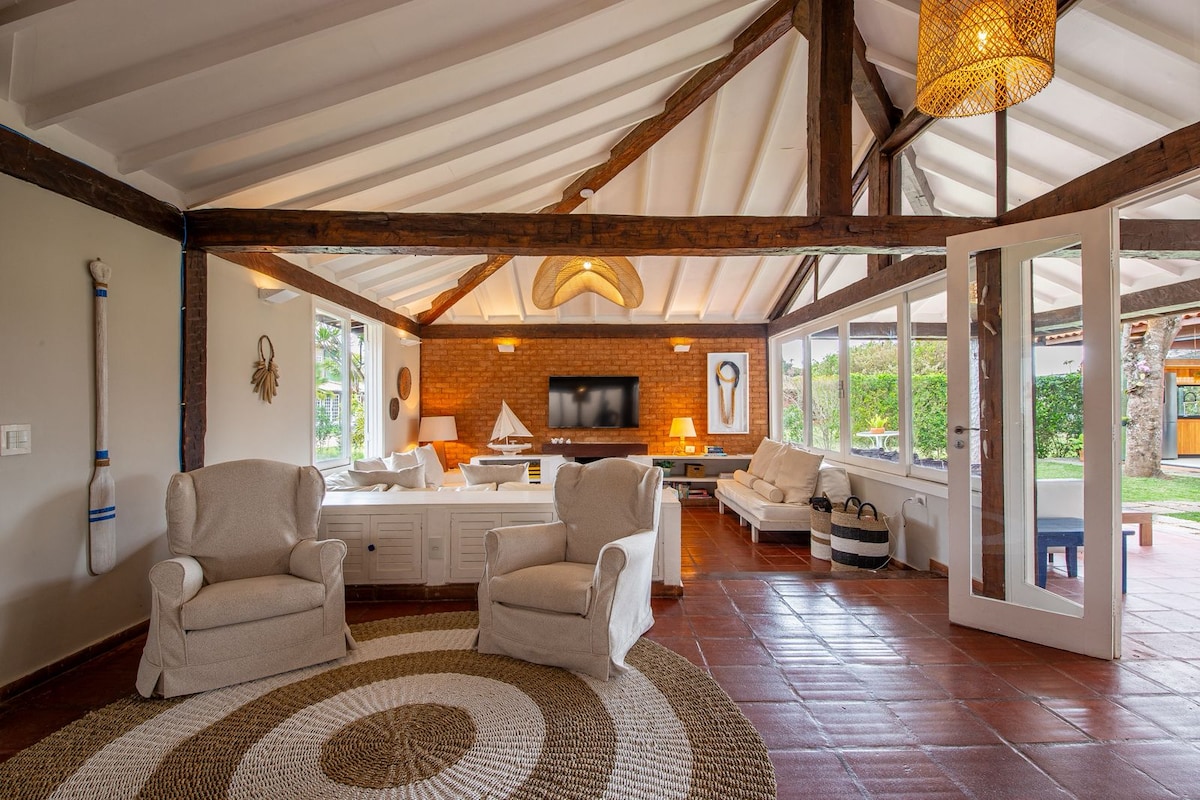 A UNIQUE EXPERIENCE IN THE BELOVED PENINSULA A charming and elegant house standing on the sand located on the reserved Rasa beach near the Ponta do Pai Vitorio overlook. The decoration was designed and idealized so that everyone has a cozy space with the comfort of their home Thinking about your total comfort and that you feel in a true private hotel, several services are available in the amount paid: daily housekeeping, garden maintenance and pool, kitchen service,