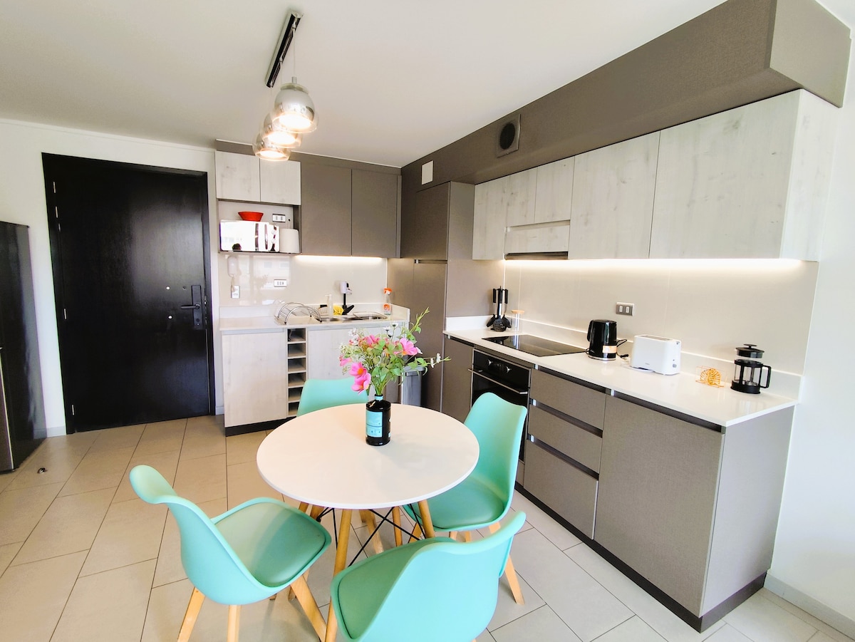 Nuevo, encantador y de lujo! Disfruta de nuestro alojamiento a pasos de la playa grande, del centro, restaurantes y supermercados. MÁXIMO 2 ADULTOS. El estudio consta de cama King y cocina/baño/terraza full equipados. Balcón con cortina de cristal y roller blackout. Orientación norte soleada. Estacionamiento público (gratuito todo el año). Incluye ropa de cama, toallas, e insumos básicos de baño y cocina. TV Netflix. A 13 km del centro de esquí y 20 min Parque Termal No se admite mascotas