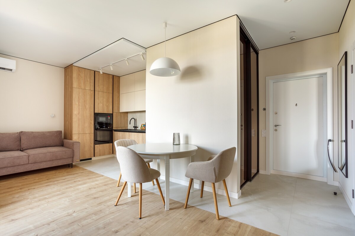 🏙️ Located on the 12st floor of a 25-story building. 🕓 Check-in anytime, 24 hours a day! No worries if you arrive late at night 🌙 ❗ All bedding is professionally cleaned in a dry cleaner! ❗ Indoor Shelter! (Undeground Parking) 💰 Included in the price: 🛏️ Comfortable Stripe Satin bed linen 🍽️ All dishes and kitchen utensils 🩴 Disposable slippers 🧼 Soap and shower gel 🌐 High-speed Wi-Fi internet ☕️ Espresso coffee machine + coffee 🍵 Tea assortment in sachets