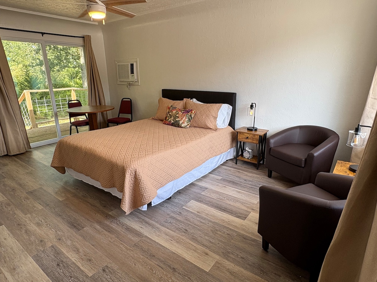 Enjoy a simple, comfortable stay in this hotel-style room with two cozy beds and a private exterior entry. Perfect for a quick getaway, fishing trip, or solo retreat, the room includes a full bathroom, coffee maker, and smart TV. Step outside to enjoy access to shared fire pits, grills, riverfront seating, a gym, sauna, and more—all just steps from the river. Clean, convenient, and peaceful—everything you need for a restful stay.