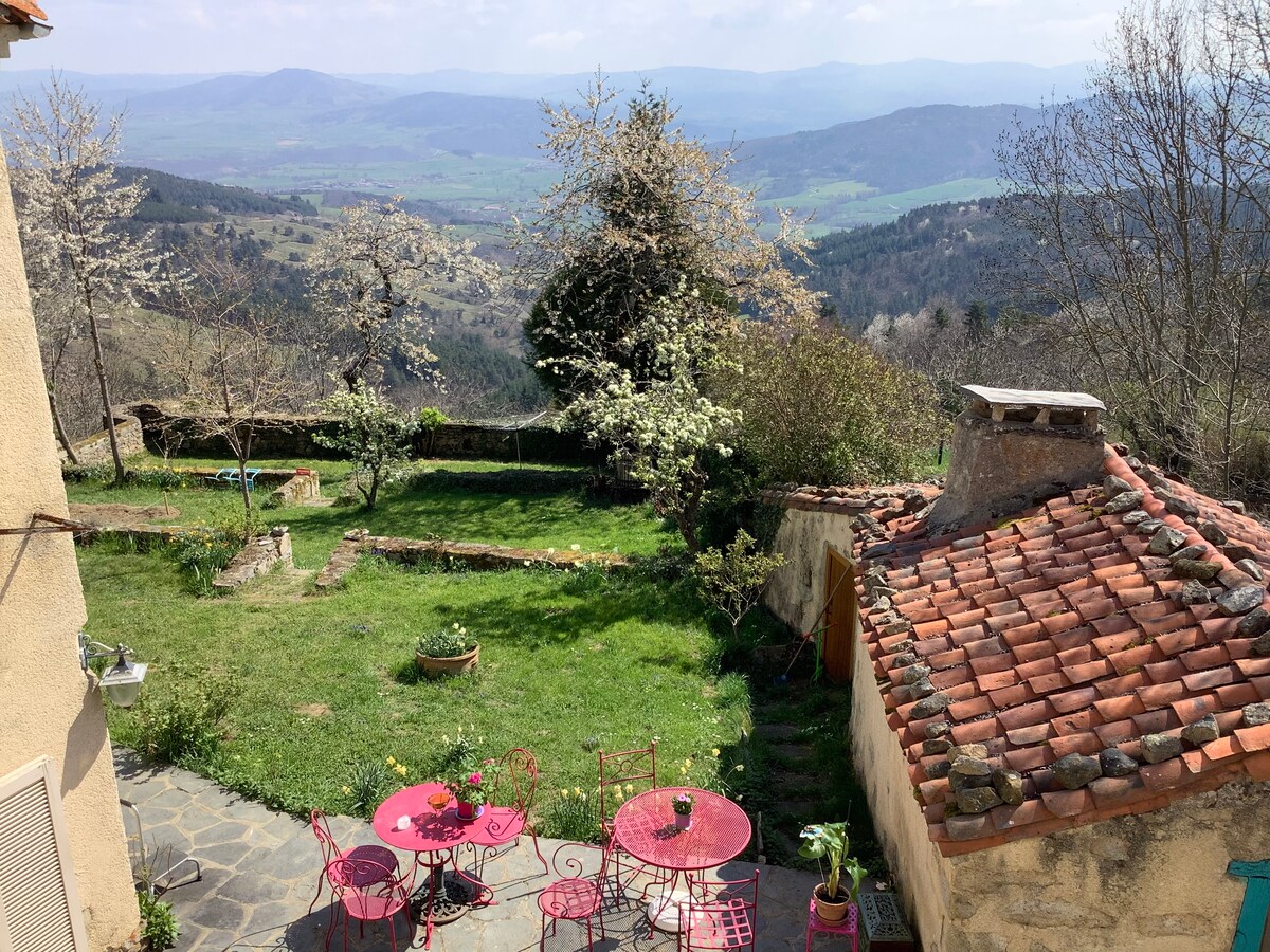 850 m high in the authentic hamlet, splendid 180º view of the Val d'Allier mountains, ideal for sunrise rest, 15 km from Cantal, 7 km from town In 1 of the 3 furnished farm buildings. Ind. entrance. Covered parking Beautiful countryside, birds, preserved setting, far from pollution. Historic and cultural sites Puy en Velay Mt Mouchet Marqu Lafayette Beast of Gévaudan Roman church Saugues canoes-kayak raft, climbing, fishing, swimming, horse riding, tennis, swimming pool, pump track, tree climbing, children's park, media library, hiking, mobility, bike markets, 3 supermarkets, restaurant, doctor, pharmacy, all services, 4G