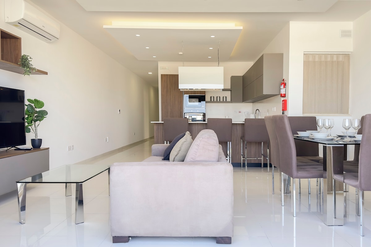 A beautiful, spacious, family and work-friendly, serviced apartment with views in Mellieha's most sought-after residential area. The apartment is fully airconditioned and has a 2/3 seater private jacuzzi on its terrace. Guests also get access to the fully equipped gym in the same building. The apartment is a 15-minute walk to Malta's largest sandy beach (2 minutes by car) and relatively close to all amenities, including supermarkets, shops, hairdressers, etc.