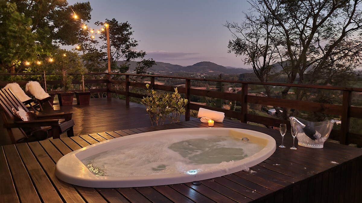 Rustic cabin at the top of the hill in Linha 32/Arroio do Meio-RS, with total privacy and capacity for 4 people, with a bedroom with a double bed and a balcony for the view, and a mezzanine with a double bed. The cabin has an outdoor whirlpool in front of the house, a wood-burning stove, a gas stove, a barbecue, Wi-Fi, a smart TV, an electric shower, an electric faucet in the kitchen, an outdoor area, overlooking the entire Taquari Valley, Arroio do Meio, Lajeado, Estrela and other cities.