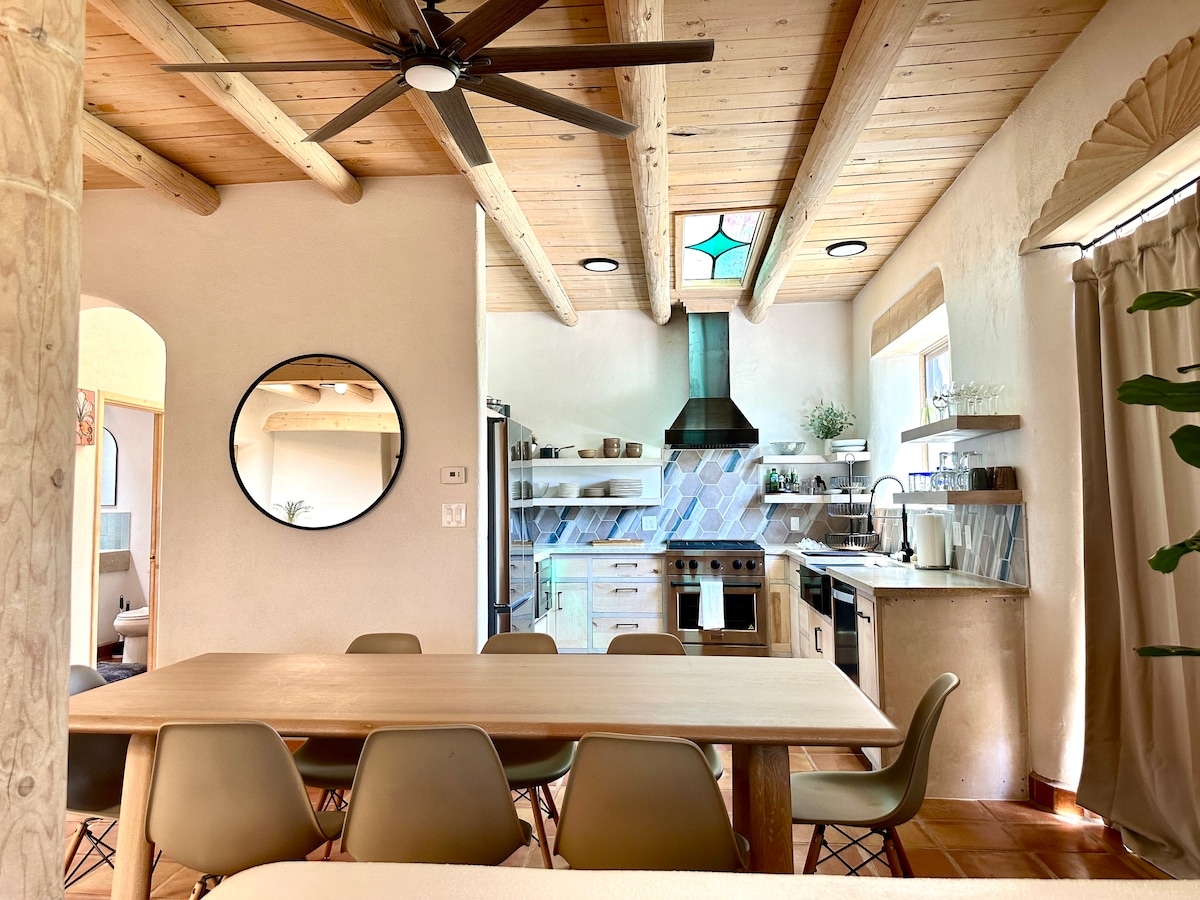 If you’re looking for comfort, relaxation, beautiful views, and stunning stargazing, you’ve found it here at Dos Caminos Casa. Enjoy almost an acre of yard with tranquil mountain views in a traditional 120-year-old adobe home with tons of natural light, viga beams on the ceiling, heated stone floors, and colorful, artistic touches. Enjoy a glass of wine in the hot tub while the Taos skies paint a canvas of rich purple, orange, and pink. Perfect retreat after a day of hiking, rafting, or skiing.