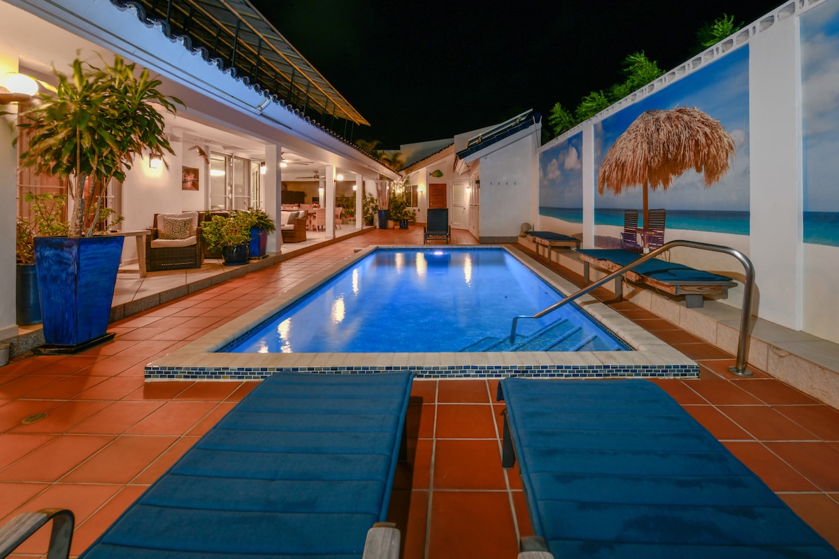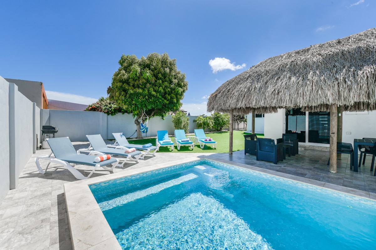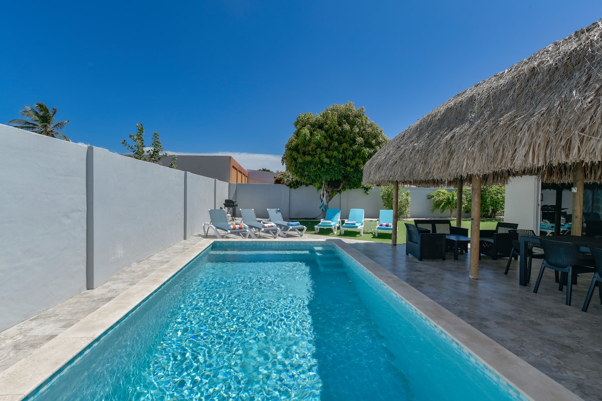 Experience Aruba at this cozy home featuring an extra-large private pool in a tropical garden.The spacious pool area boasts a deck with comfortable lounge chairs, an outdoor patio, with a grill. Enjoy your day by the pool or take a short 15-minute stroll to the nearest beach. Inside, a modern kitchen equipped with all essentials awaits. The entire house is air-conditioned, and the bedrooms are both modern and roomy. Make lasting memories with friends and family at this perfect vacation home.