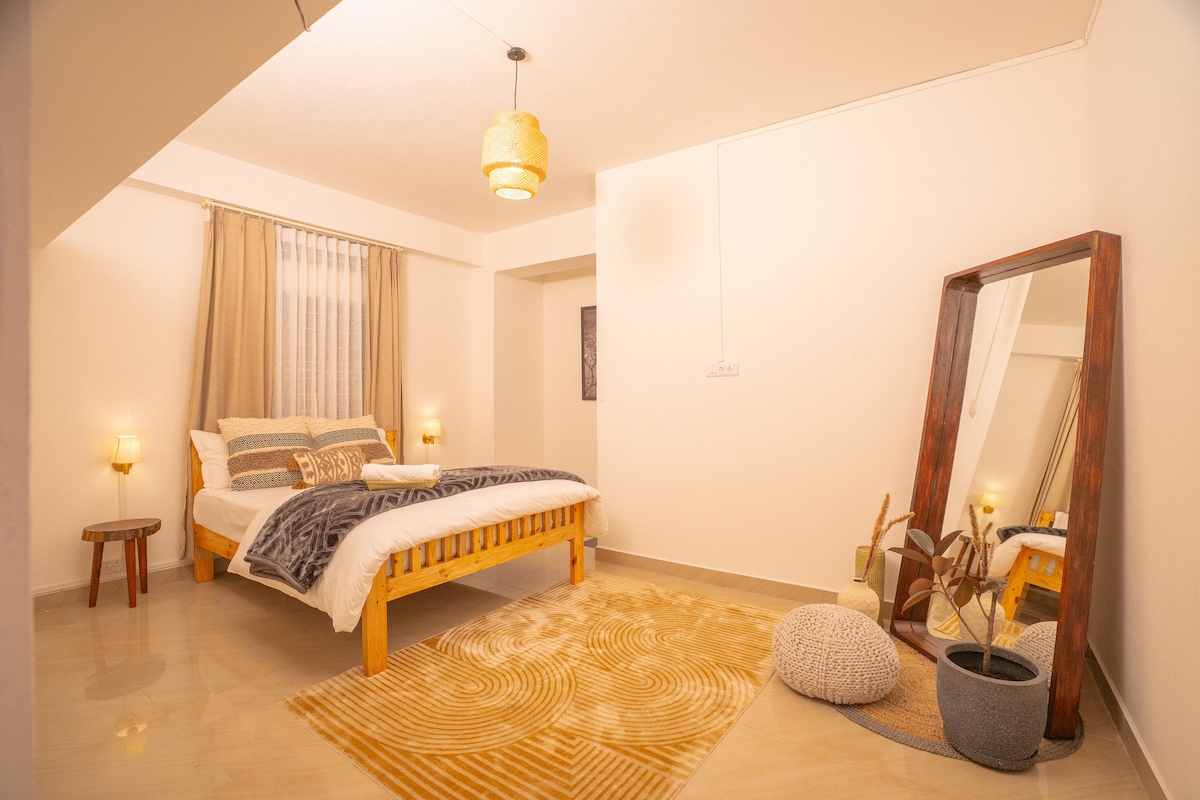 Step into a warm and thoughtfully designed 2BHK retreat in Shillong, styled with soft earthy tones, handcrafted wooden furniture and cozy boho accents. The apartment offers a spacious living room, serene bedrooms with hotel-style bedding and a charming dining nook with a live-edge wooden table. Soft lighting, curated décor and peaceful surroundings make this the perfect space to relax, unwind and feel completely at home. Perfect for couples, families or anyone seeking a peaceful mountain escape.