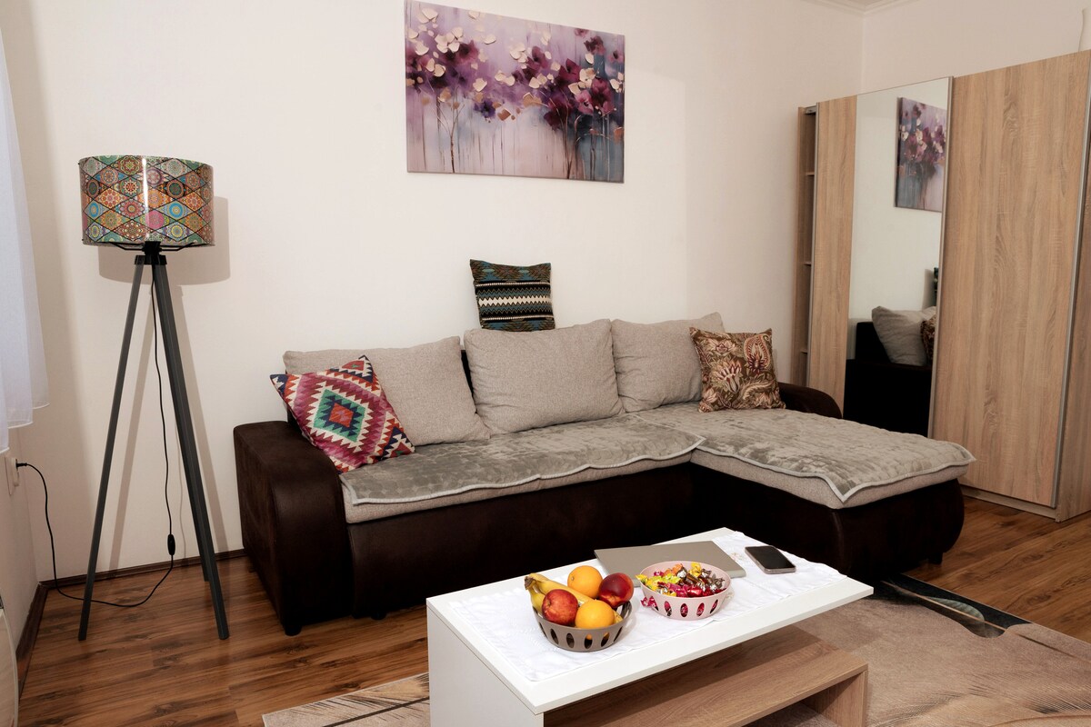 Apartment Lara, comfortable and cozy accommodation in a quiet part of the city, 800m from the center. The apartment is 37 square meters. Bedroom, kitchen, bathroom, dining room, hallway, street entrance. Kitchen equipped with standard, plus kettle and toaster. Laundry service available. There are two markets nearby. We're at the guests' service all day! Smoking is allowed. The key safe is not in operation.