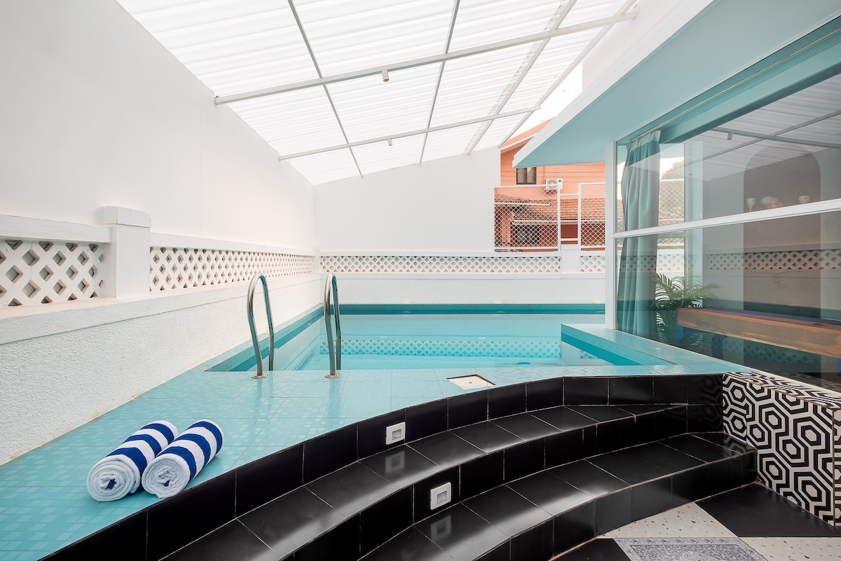 Escape to your private tropical hideaway in the heart of Calangute. Please note: * The plunge pool is fully personal & private, attached to the bedroom with a beautiful view of the Goan palm trees (it’s not a jacuzzi or hot tub). * Guests also have access to a shared rooftop pool (8 am–8 pm), perfect for sunset dips. * Power backup available for lights, fans, Wi-Fi, and charging.