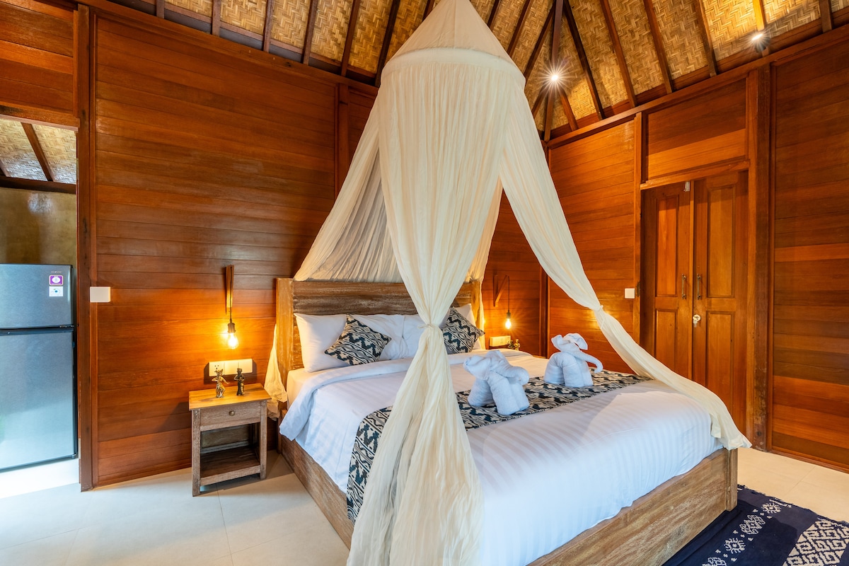 A confortable river view bamboo bungalows part of 5 exclusive cabins discretely nestled among trees. Built and equipped sustainably with the smallest footprint on its environment Bird watch from the comfort of your hammock on your private balcony or lounge by the 12m infinity pool overlooking the river Once re-energized by nature, you can head 15mn north to Bali's bustling cultural hub in central Ubud town and a foody's dream or drive 20mn east to the closest black sand beach of Saba