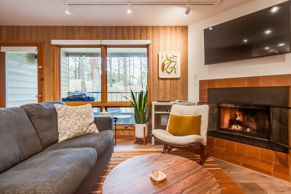 A perfect home base for all your adventures in Bend! Just a 10 minute walk from downtown. Walk or bike to the best restaurants and breweries in Bend. Swimming, hiking, and fishing in the Deschutes river steps from your doorway. King Bed~ Gas fireplace ~ Reading nook ~ Comfy queen sleeper sofa ~ Air Conditioning ~ Games ~ 2 TVs ~ Full kitchen ~ 2 balconies ~ Keyless Entry ~ Shared laundry room ~ 2 Bathrooms ~ K Cup coffee bar ~ Private WiFi ~ Roku TVs