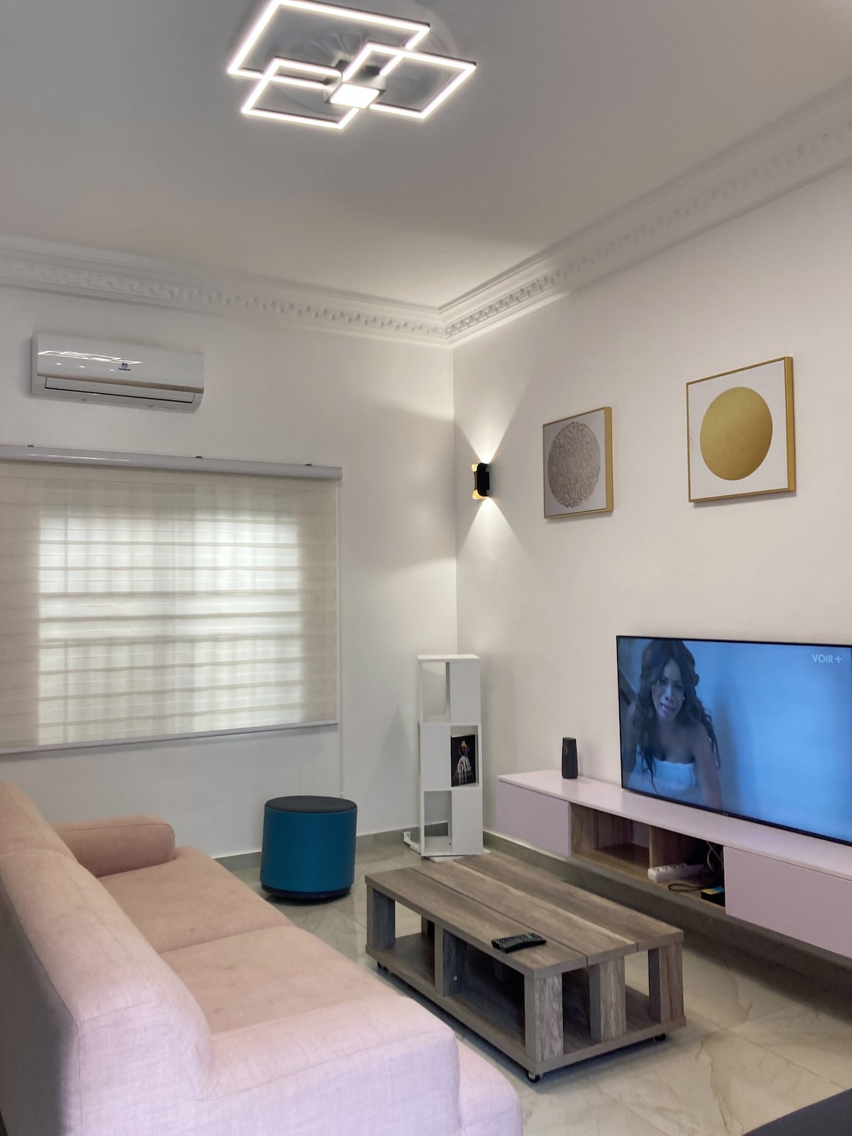 Enjoy your stay in this cozy, quiet, and chic space. Which comes with free WiFi, smart tv, Air Conditioned room and parlor, equipped kitchen, cleaning agents, open plan toilet, personal entry with no garage, balcony etc…