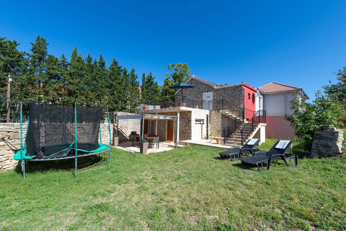 Holiday house Jona is located in a small village in the heart of "Ravni Kotari". The house is located on a 7000 square meter ranch that has a large guest-only swimming pool and is surrounded by vineyards and various fruit trees that guests have at their disposal. The house is ideal for a complete dream vacation where you can afford complete peace of mind. House Jona is new and fully equipped with dishwasher,washing machine,coffee aparat,grill,air conditioning,wi-fi internet, ultra-slim TV, etc.