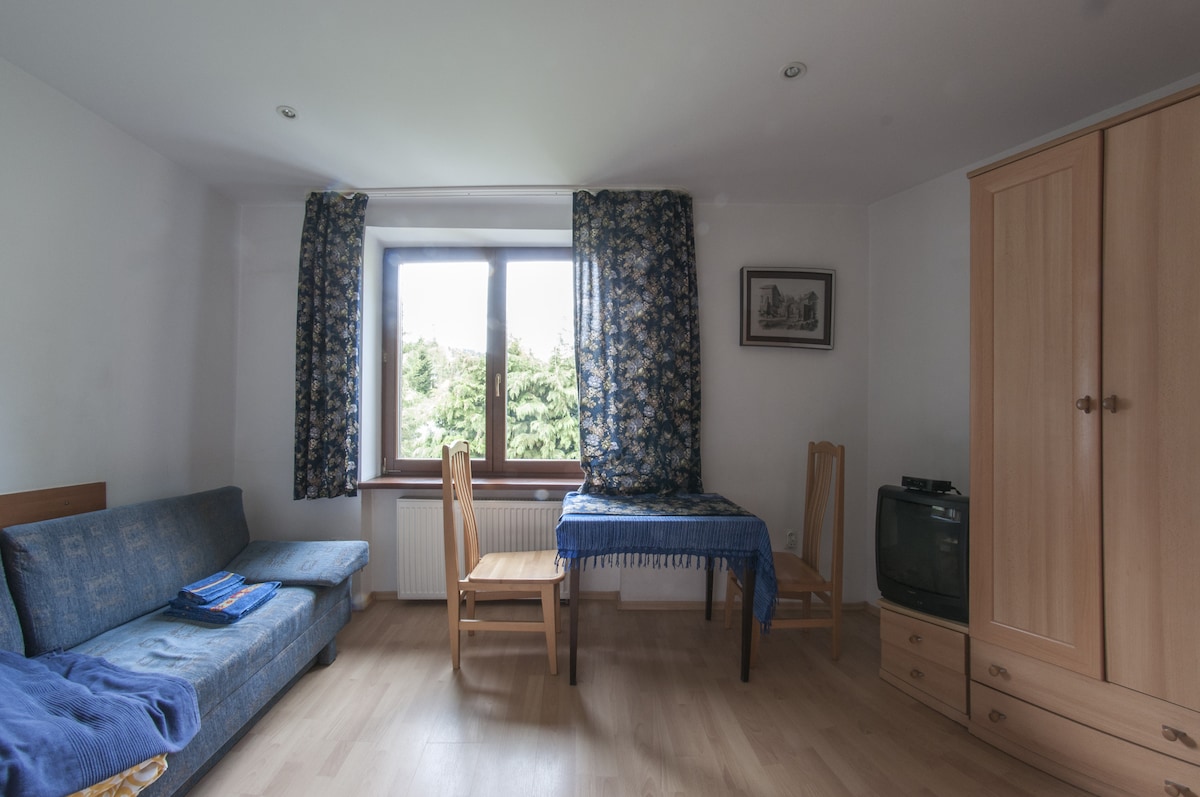Treat yourself to rest and quiet. A comfortable, well-equipped apartment consisting of a room connected to a kitchenette, a bathroom and a large terrace with a beautiful view of the forest and mountains. Perfect for a couple. The apartment is located on the ground floor of an intimate and completely renovated building consisting of 6 apartments, which are available only to our Guests. GREAT LOCATION! Quiet and green neighborhood. 20 minutes walk to the center of Krynica and the promenade.
