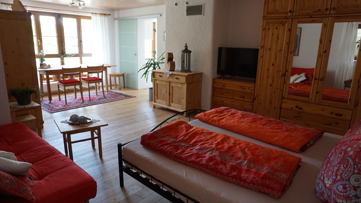 Dear guests, Our apartment is located in the small, beautiful village of Ahausen, a suburb of Bermatingen, and is perfect for relaxing from everyday life due to its location. The vacation apartment is located in the basement of your host's single-family home, surrounded by orchards and fields. Meersburg, Markdorf and Salem are 6 km away, Überlingen and Friedrichshafen about 20 km.