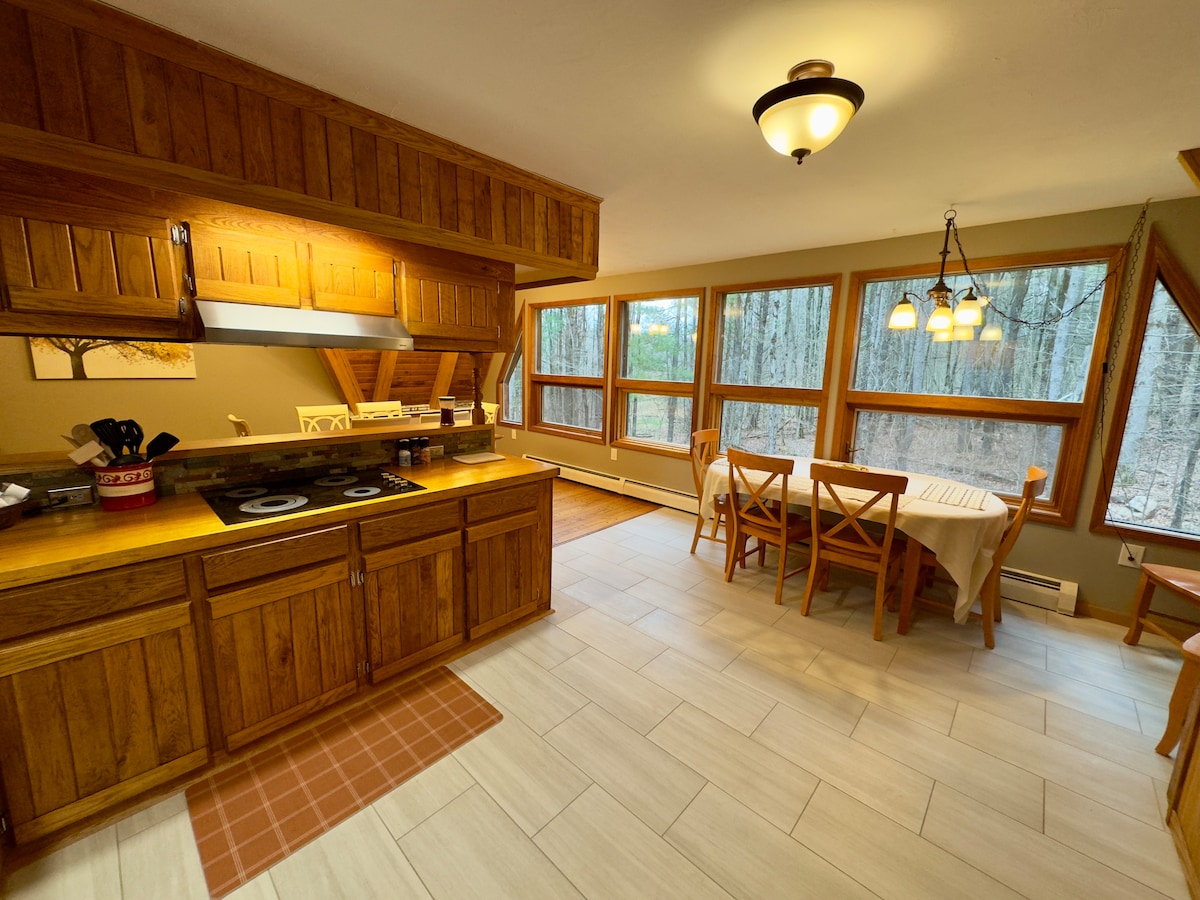 A beautiful slice of nature and unique cabin on 30 acres of land with modern ammenities. Enjoy distant views of hills through huge windows overlooking a swimming pond. It's a retreat for every season, featuring beautiful fall folliage, hiking, cross-country skiing and a lush and picturesque spring and summer. The house features a round kitchen and bedroom with a vaulted ceiling. Enjoy a giant view of the sky, fire pit by the pond, the sound of frogs, meditate, relax, or … work!