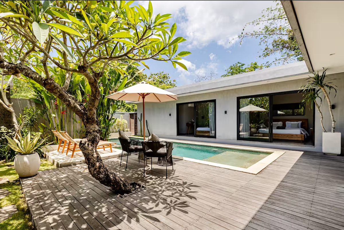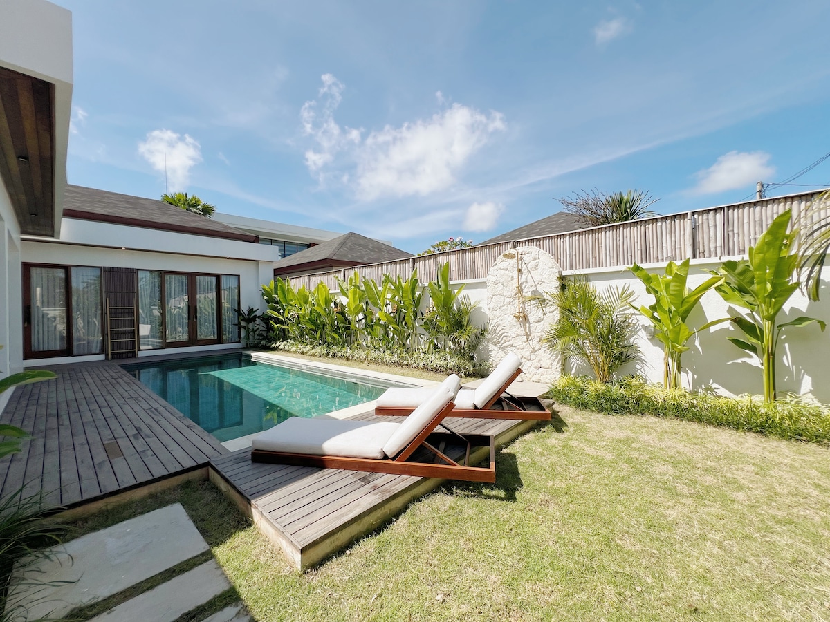 Brand New Designer Villa in Peaceful South Bali • 1 stylish air-conditioned bedroom with en-suite bathroom • Large swimming pool surrounded by tropical greenery • Bright open-plan living room & fully equipped modern kitchen • 300 Mbps Wi-Fi for work & streaming • Netflix & PS5 on request • Large outdoor terrace perfect for BBQs & lounging • Daily cleaning with fresh towels & linens • Baby cot & high chair on request • Concierge service for airport transfers, scooter rentals, spa bookings & more