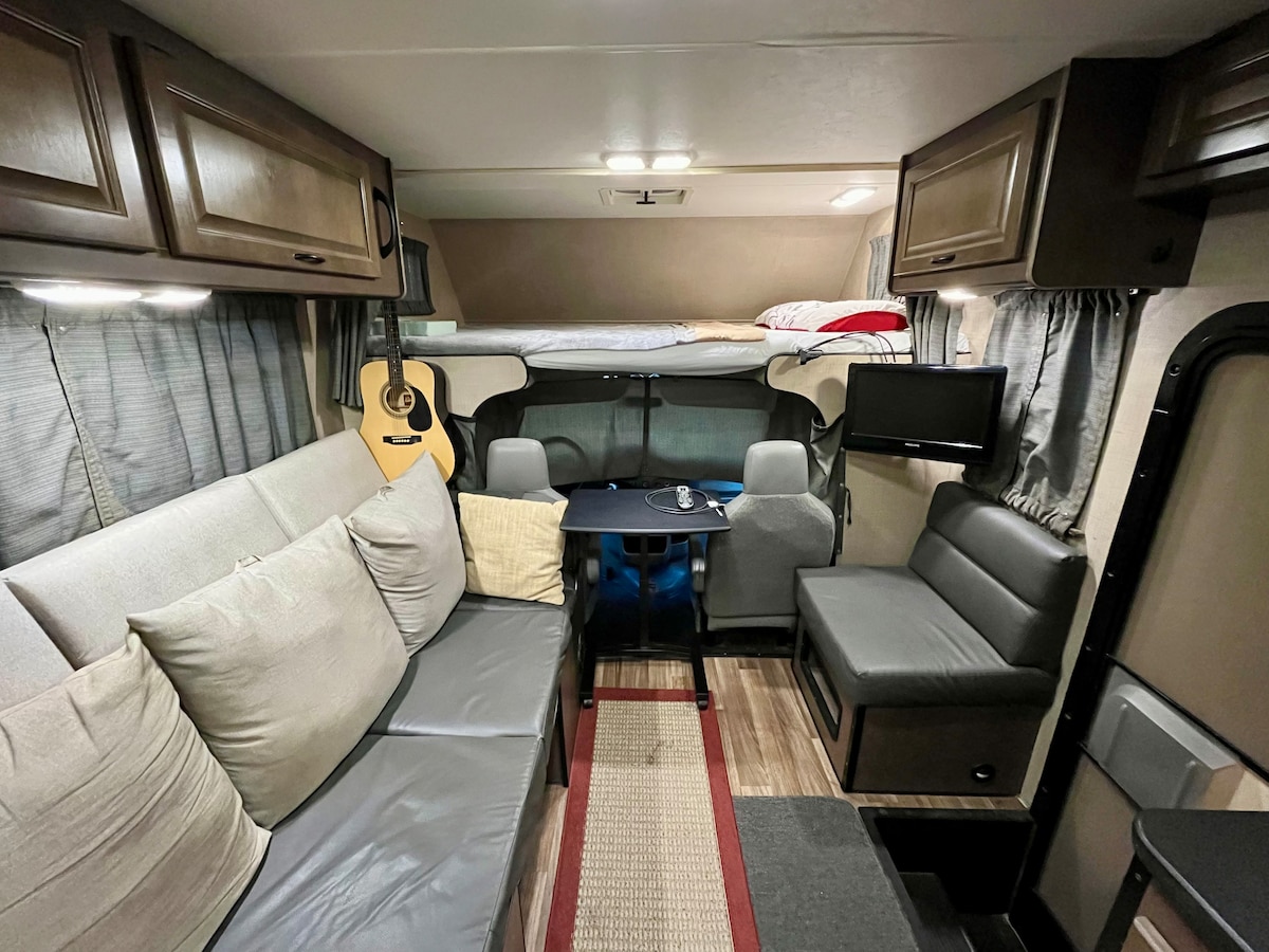 An efficient layout showcases the interior of the airstream, featuring a modern kitchenette with a sink and seating area. Along one wall, sleek bar stools are positioned in front of a counter. Soft lighting creates a cozy atmosphere, enhancing the vintage charm.
