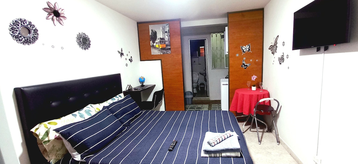 Nice fully equipped apartment, central, in the heart of Bogotá, for 1 or 2 people, private parking with roof for 1 car, 24-hour surveillance building, 4th floor and elevator to 360° view terrace, close to restaurants and tourist sites. Hot water, fully equipped gas kitchen, large bed, high-quality king-size mattress, 300Mb fibre optic Internet, 2.4/5Ghz WiFi, office/study area, 65" 4K TV, National HD TV, noise-resistant window. Enquire or book now! (ᵔᴥᵔ)