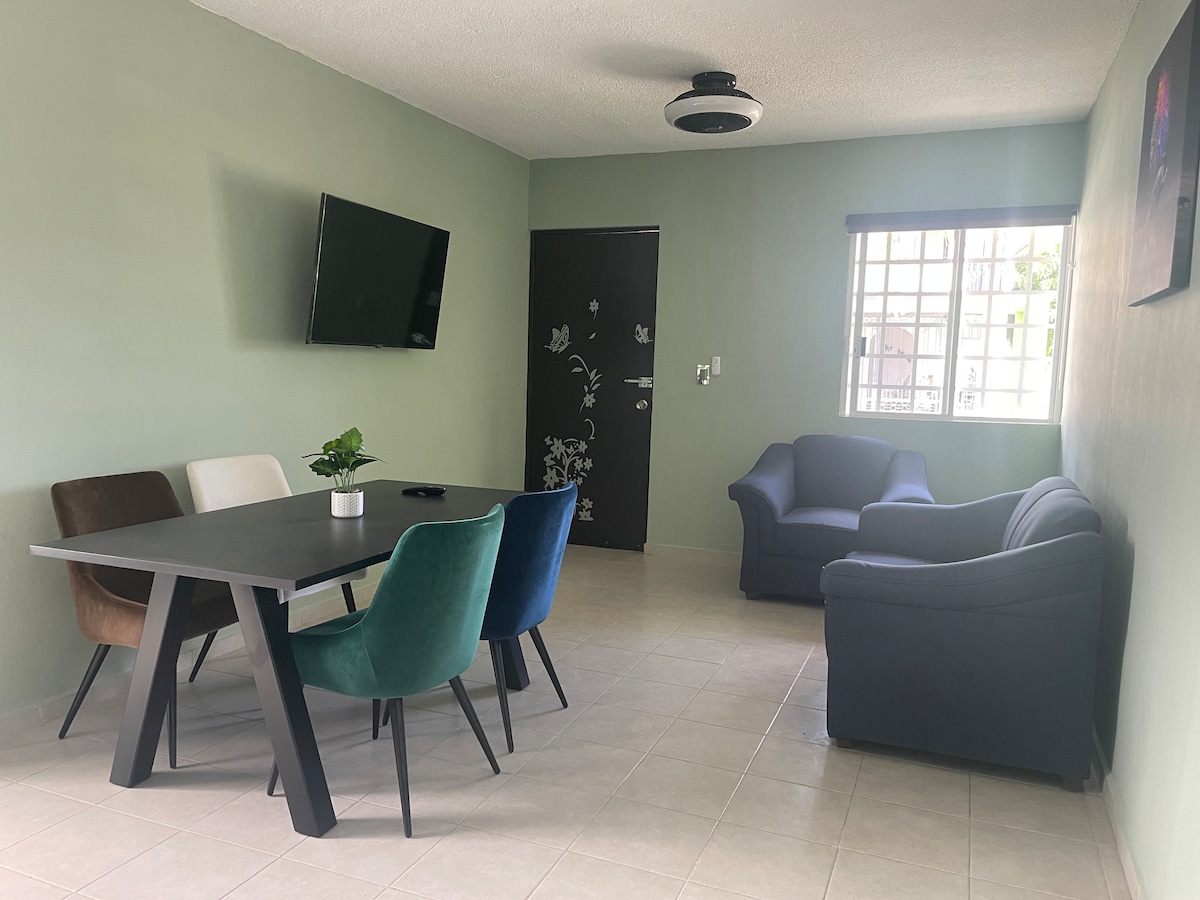 Apartment for up to 6 people, space to park 2 cars, private, surveillance, security camera, Wi-Fi, hot water with pressure, living room, dining room, kitchen, 2 bedrooms and 1 study that can be used for sleeping with an inflatable mattress, A/C and fans. TV with Netflix. Excellent location, Oxxo, Extra, pharmacy, gas station, Soriana San Joaquín and many establishments are very close. 1 minute from the ring road.