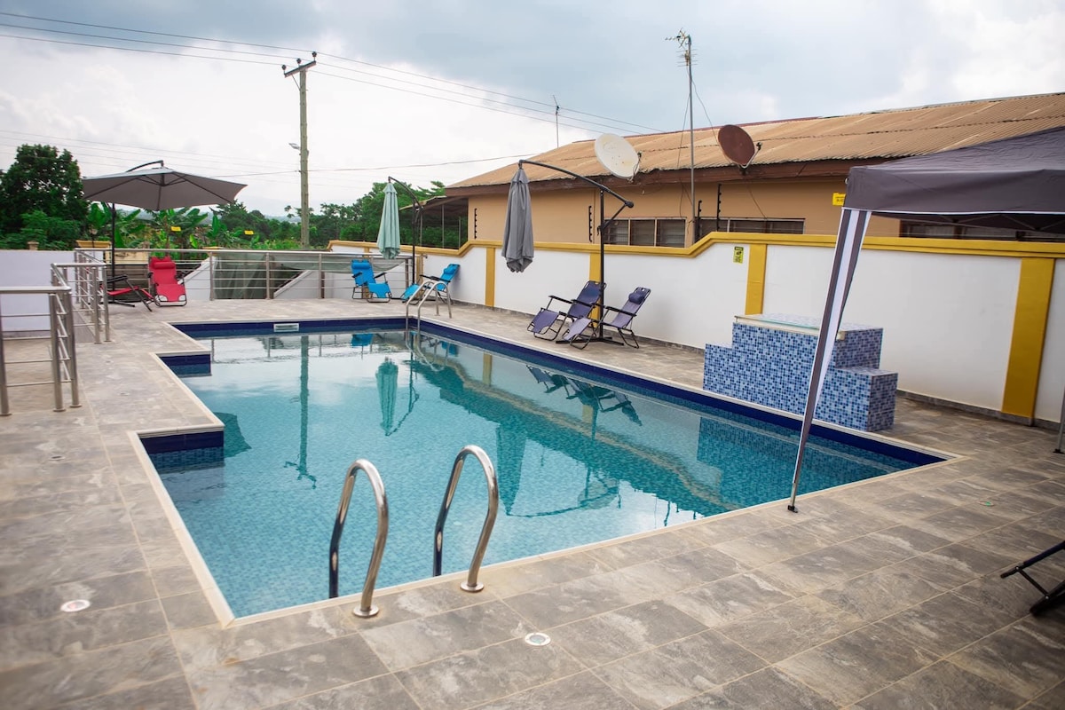Tranquil Getaway, hiking trail, breathtaking nightviews, with stunning sights overlooking the city from our exclusive at Palm Heights Homes. Located on the top of Obuotabiri Mountain for nature lovers, 45 minutes drive each to Boti falls and Bunso Eco Park. Experience a perfect romantic getaway! A serene environment, 1hour 30 minutes drive to Peduase Valley Resort and Aburi Botanical Gardens. Come and enjoy your stay!