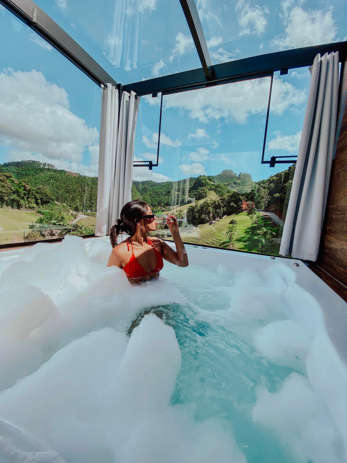 Cabana sobre um vale repleto de natureza, tranquilidade e estilo, possui banheira aquecida externa (sem hidro), varanda e área interna de sofá com parede e teto de vidro. Banheiro privativo com ducha aquecida por aquecedor central (gás) A cabana dispõe de Wi-Fi, TV smart, cozinha com geladeira, fogão de indução duas bocas, Airfryer e demais utensílios de cozinha. Toalhas e roupas de cama são opcionais e não estão incluídas na diária. Check-in 14:00h check-out 11:00h