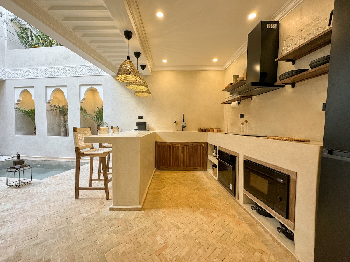 It is a small riad in the heart of the Medina of Marrakech, completely rebuilt in place of a pre-existing ruin. It consists of an entrance, living room with fireplace, dining area, kitchen and bathroom on the ground floor, all rooms are arranged around the patio. On the first floor, there is a double bedroom, a large bathroom, and a hallway with the possibility of a third bed. On the third level, there is a terrace equipped with seating and a breakfast table.