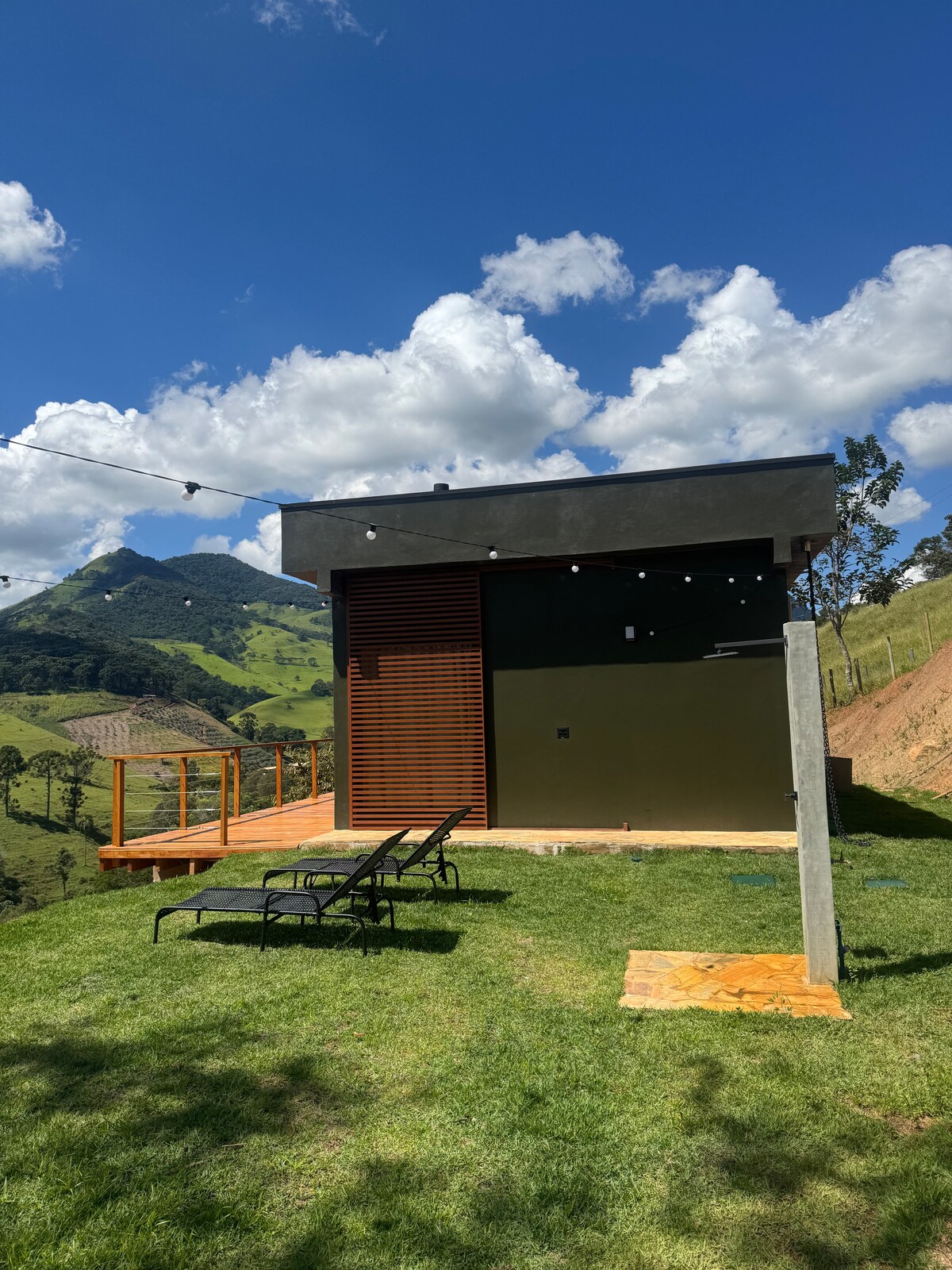 Descubra o encanto da Serra da Mantiqueira nesta cabana projetada para que você possa contemplar o nascer do sol sem sair da cama. Venha relaxar em nosso spa aquecido, observar as estrelas na rede suspensa e balanço. A cabana possui um quarto integrado com uma aconchegante cama Queen. Na sala/cozinha, um futon super confortável acomoda mais dois hóspedes, tornando a experiência ideal para famílias. A propriedade também conta com trilhas e pequenas quedas d'água.