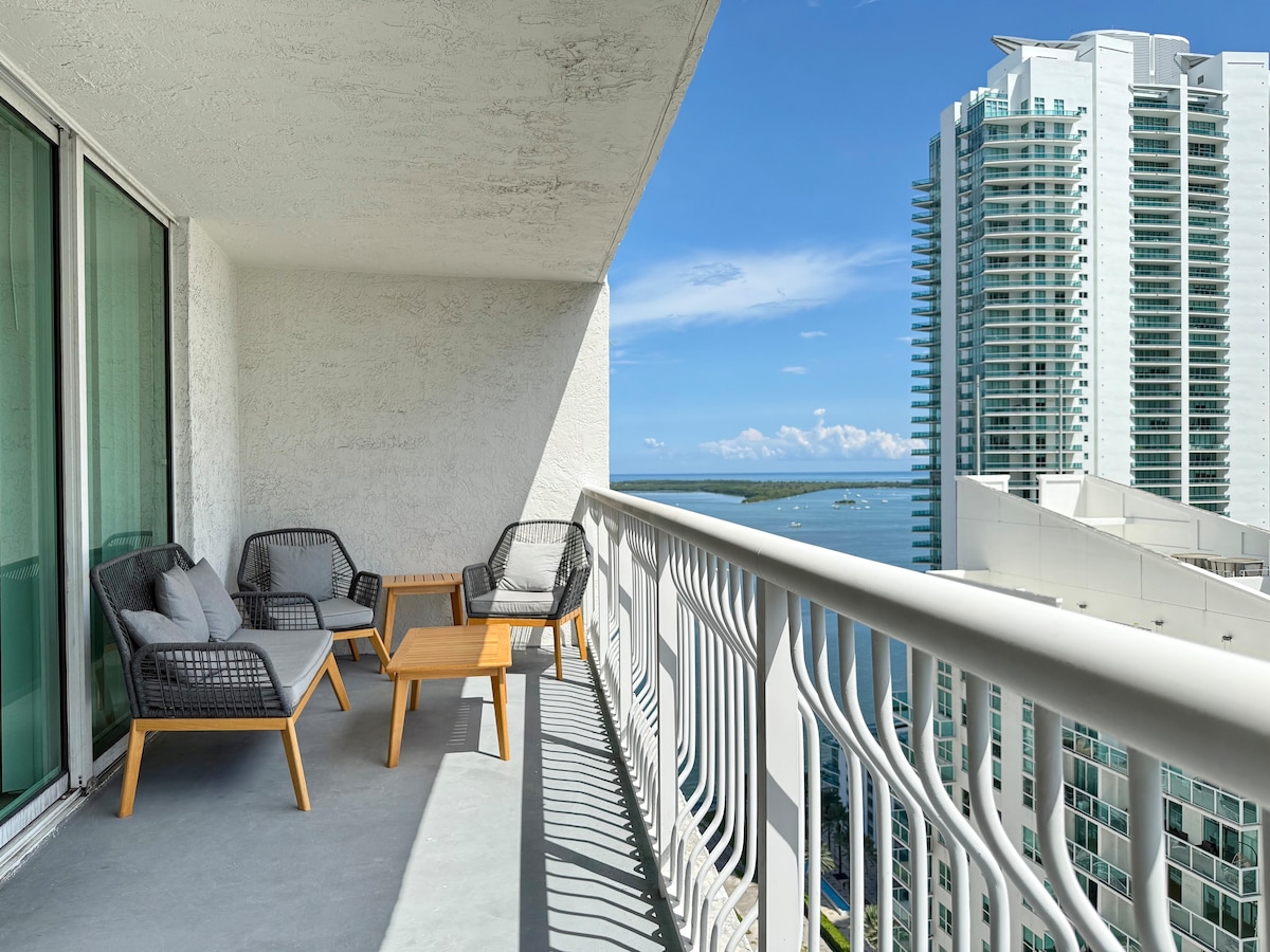Top floor modern designer Penthouse, two bedroom, two bath, right in the heart of Miami. Enjoy style, convenience, and breathtaking views of Miami from your private wrap around balcony & take in panoramic vistas of the ocean, yachts and city. Kitchen features new stainless-steel appliances. Living room boasts brand new 4K Smart TV with dinning area. Master Bedroom has ultra comfy king size bed + en-suite, stylish Queen room both with smart TV’s. Brand new bathrooms, washer & dryer in Penthouse