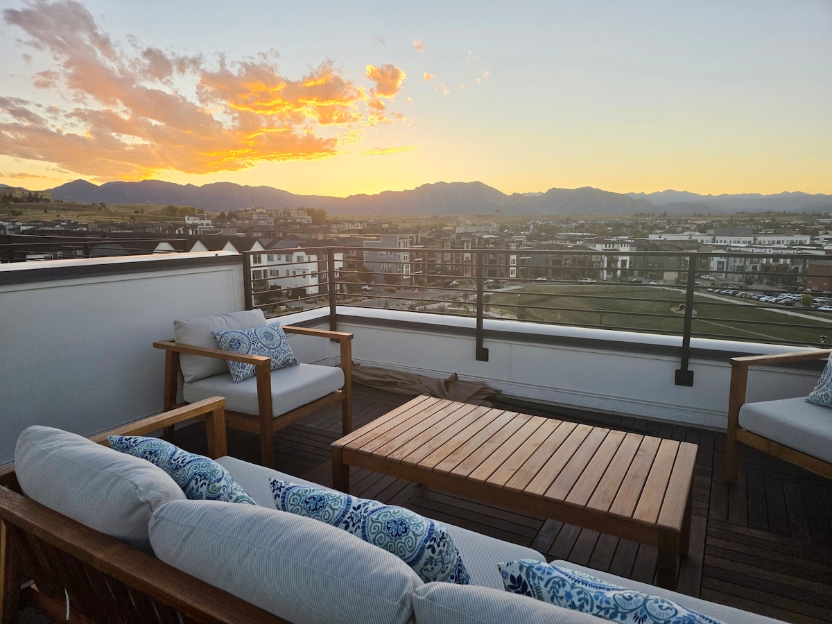Enjoy picturesque views of the Rocky Mountains from your bedroom or patio. Explore Boulder, Denver or our world renowned mountains. Venture into our Open Space trails. Walk to the comforts of your favorite stores and restaurants. Relax at home over dinner or a drink in a comfortable setting all to yourself. ⋅300 SF Rooftop Patio with 180˚ views overlooking the Rockies ⋅650 SF interior in a new home ⋅Walk to stores, dinner, coffee or drinks ⋅Fully stocked kitchen ⋅In unit W/D ⋅Self check in