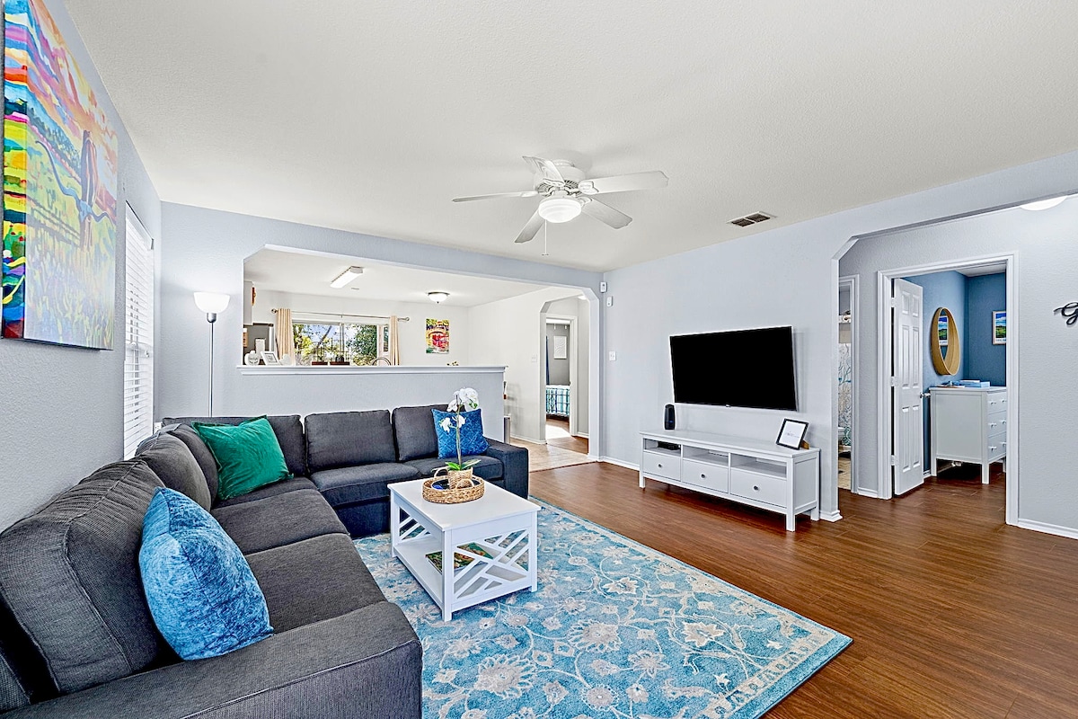 NO CHECK-OUT TASKS, our cleaners take care of it all! Pet friendly 1 story 3 bedroom 2 bath LARGE Fenced Yard 3 mins to JW Marriott 15 mins to airport 20 mins to downtown 25 mins to Fiesta Texas 30 mins to Sea World/San Marcos/tubing. Can sleep 6 comfortably & 10 with air mattresses (not provided). bedrooms have memory foam mattress (Layla/tuft n needle), 40”-55” smart TVs and walk-in closets. Living room has a premium 50” electric fireplace, comfortable leather sofas & 65” smart TV