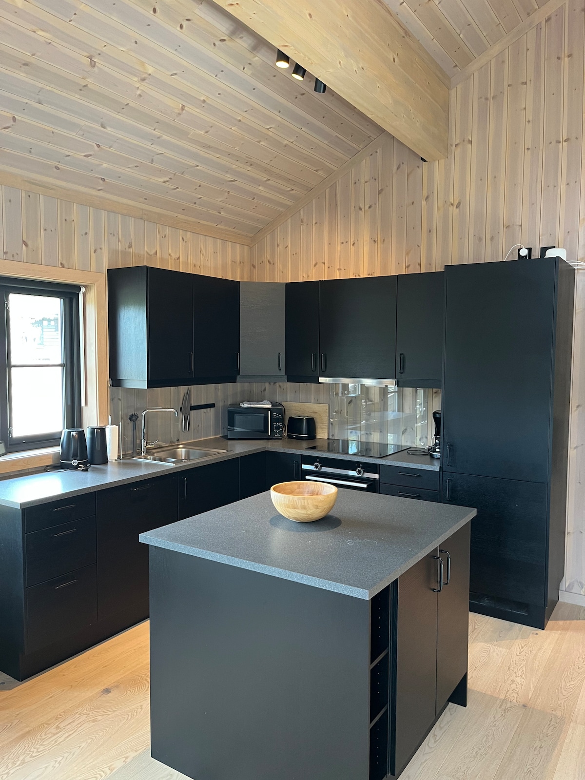Our cabin is new and has a very high standard. The decor is modern and of good quality. The cabin has a natural color scheme that is inspired by nature's color palette. Heating cables in the floor provide a pleasant warmth throughout the cabin. There is a separate bathroom with a sauna and a separate toilet. We are committed to our guests sleeping well. All beds are of good quality. One double bed 180 cm wide, one bed 120 cm wide, four beds 100 cm wide. All beds are made and bed linens and towels are included in the price.